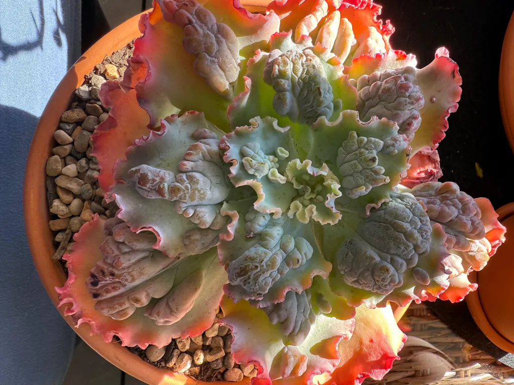 Echeveria `Marjorie Pogue' forms a large rosette with frilly and carunculated leaves that can reach over 30cm in diameter.
